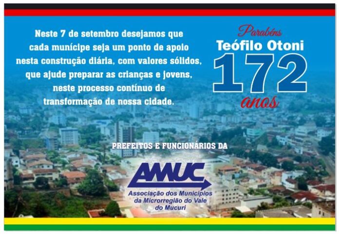 A Associação dos Municípios da Microrregião do Vale do Mucuri – AMUC, parabeniza Teófilo Otoni, cidade polo do Vale do Mucuri, pelos seus 172 anos de emancipação política, celebrados neste dia 7 de Setembro, data marcante em que também celebramos o Dia da Independência do Brasil.