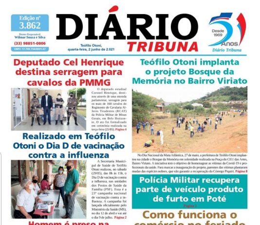 Diário Tribuna, 2 de Junho 2021, Teófilo Otoni – MG