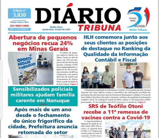 Diário Tribuna, 15 de Abril 2021, Teófilo Otoni – MG