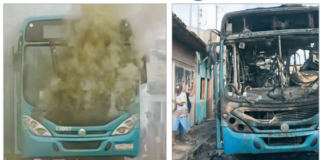 Ônibus da Viação Vale do Mucury pega fogo, na Vila Progresso