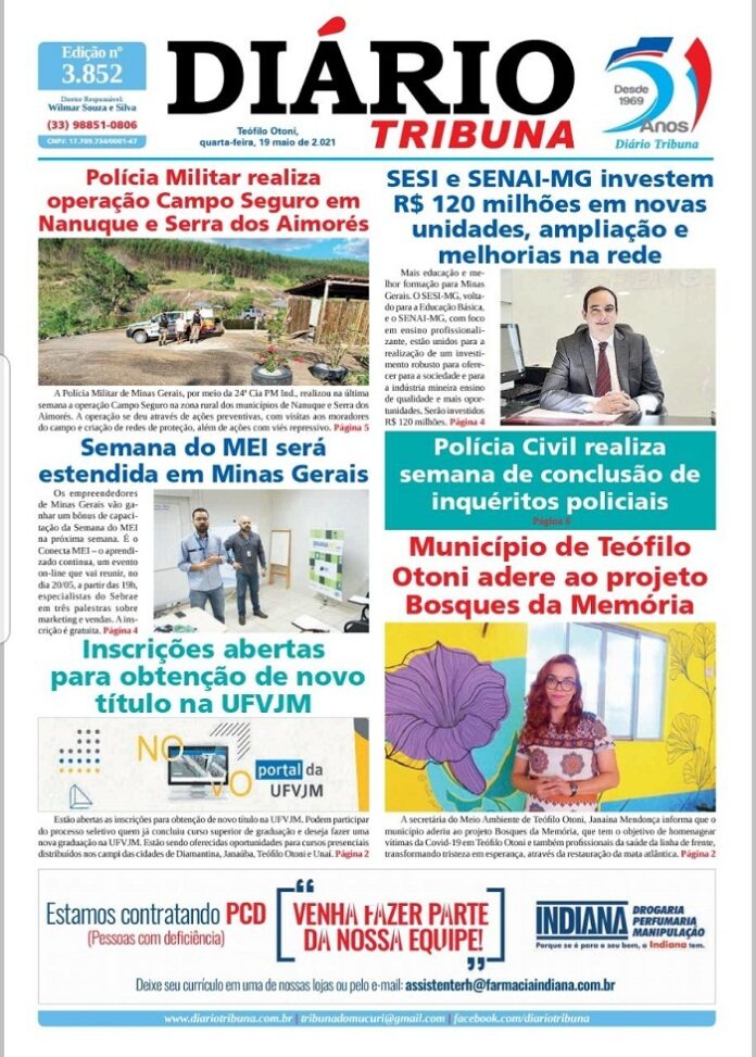 Diário Tribuna, 19 de Maio 2021, Teófilo Otoni – MG Por diariotribuna - 19/05/2021 0 765 Facebook Twitter Google+ Pinterest WhatsApp Acesse o link abaixo e veja a edição completa do Diário Tribuna desta Quarta-feira (19/05/2021) https://diariotribuna.com.br/wp-content/uploads/2021/05/DIARIO-TRIBUNA-51-ANOS-19-MAIO-2021.pdf
