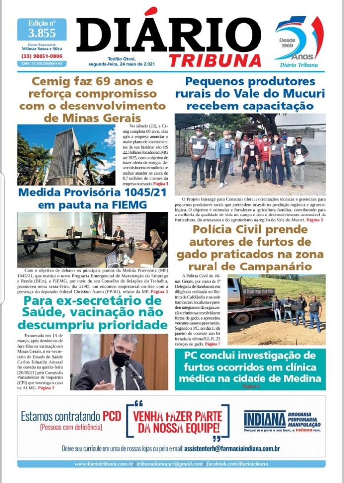 Diário Tribuna, 24 de Maio 2021, Teófilo Otoni – MG Por diariotribuna - 24/05/2021 0 956 Facebook Twitter Google+ Pinterest WhatsApp Acesse o link abaixo e veja a edição completa do Diário Tribuna desta Segunda-feira (24/05/2021) https://diariotribuna.com.br/wp-content/uploads/2021/05/DIARIO-TRIBUNA-51-ANOS-24-MAIO-2021.pdf