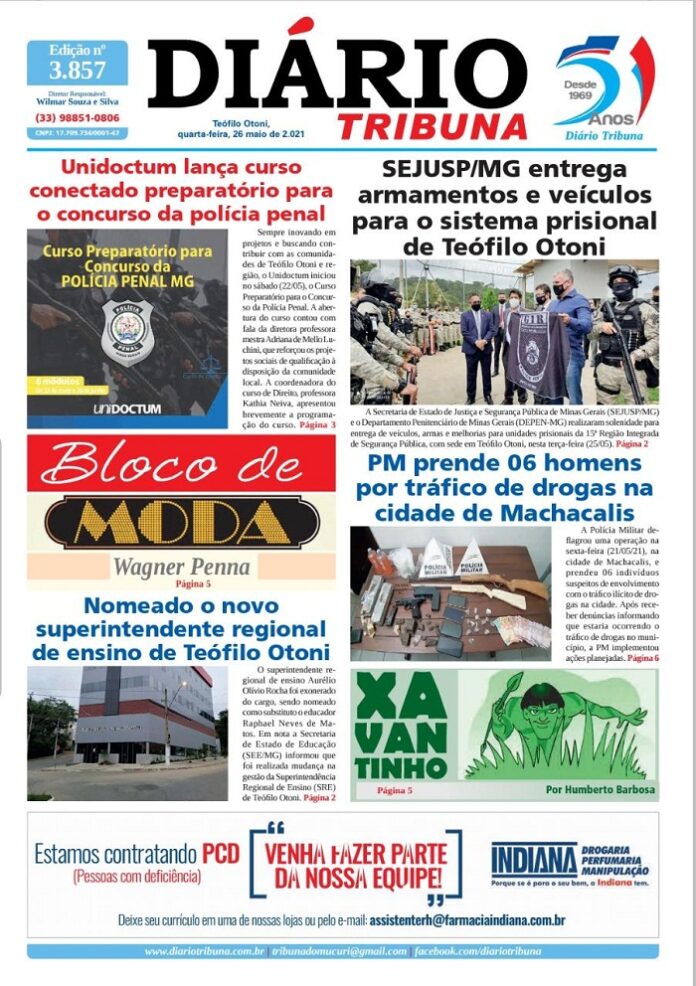 Diário Tribuna, 26 de Maio 2021, Teófilo Otoni – MG Por diariotribuna - 26/05/2021 0 506 Facebook Twitter Google+ Pinterest WhatsApp Acesse o link abaixo e veja a edição completa do Diário Tribuna desta Quarta-feira (26/05/2021) https://diariotribuna.com.br/wp-content/uploads/2021/05/DIARIO-TRIBUNA-51-ANOS-26-MAIO-2021.pdf