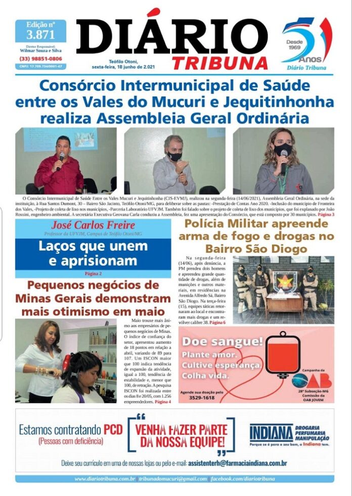 Diário Tribuna, 18 de Junho 2021, Teófilo Otoni – MG Por diariotribuna - 18/06/2021 0 820 Facebook Twitter Google+ Pinterest WhatsApp Acesse o link abaixo e veja a edição completa do Diário Tribuna desta Sexta-feira (18/06/2021) https://diariotribuna.com.br/wp-content/uploads/2021/06/DIARIO-TRIBUNA-51-ANOS-18-JUNHO-2021.pdf