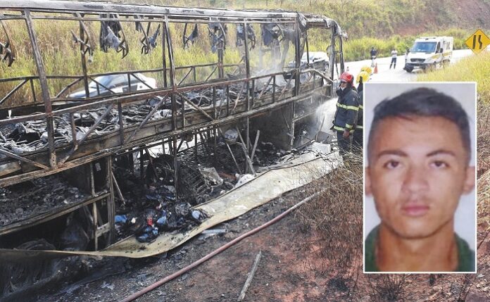 De acordo com o Corpo de Bombeiros, no impacto entre os veículos já houve o incêndio, e o motorista do ônibus disse que pressionou a porta com um chute para abrir e os passageiros descerem. No ônibus havia 9 passageiros e uma mulher fraturou a perna ao descer e tropeçar em uma canaleta à margem da pista. Ela foi socorrida pelo SAMU e encaminhada a um hospital em Teófilo Otoni. Posteriormente, no IML, a vítima fatal foi identificada como sendo Wesley Silva da Costa, de 27 anos, bombeiro hidráulico, que saiu de Teófilo Otoni para Governador Valadares. As causas e circunstâncias do acidente serão investigadas pela Polícia Civil (Foto: Divulgação).