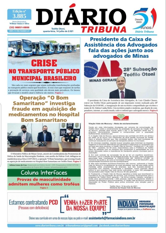 Diário Tribuna, 14 de Julho 2021, Teófilo Otoni – MG Por diariotribuna - 14/07/2021 0 372 Facebook Twitter Google+ Pinterest WhatsApp Acesse o link abaixo e veja a edição completa do Diário Tribuna desta quarta-feira (14/07/2021) https://diariotribuna.com.br/wp-content/uploads/2021/07/DIARIO-TRIBUNA-51-ANOS-14-JULHO-2021.pdf