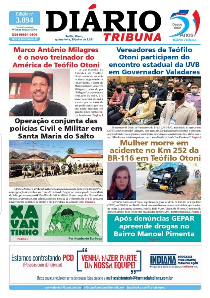 Diário Tribuna, 29 de Julho 2021, Teófilo Otoni – MG Por diariotribuna - 29/07/2021 0 772 Facebook Twitter Google+ Pinterest WhatsApp Acesse o link abaixo e veja a edição completa do Diário Tribuna desta quinta-feira (29/07/2021) https://diariotribuna.com.br/wp-content/uploads/2021/07/DIARIO-TRIBUNA-51-ANOS-29-JULHO-2021.pdf