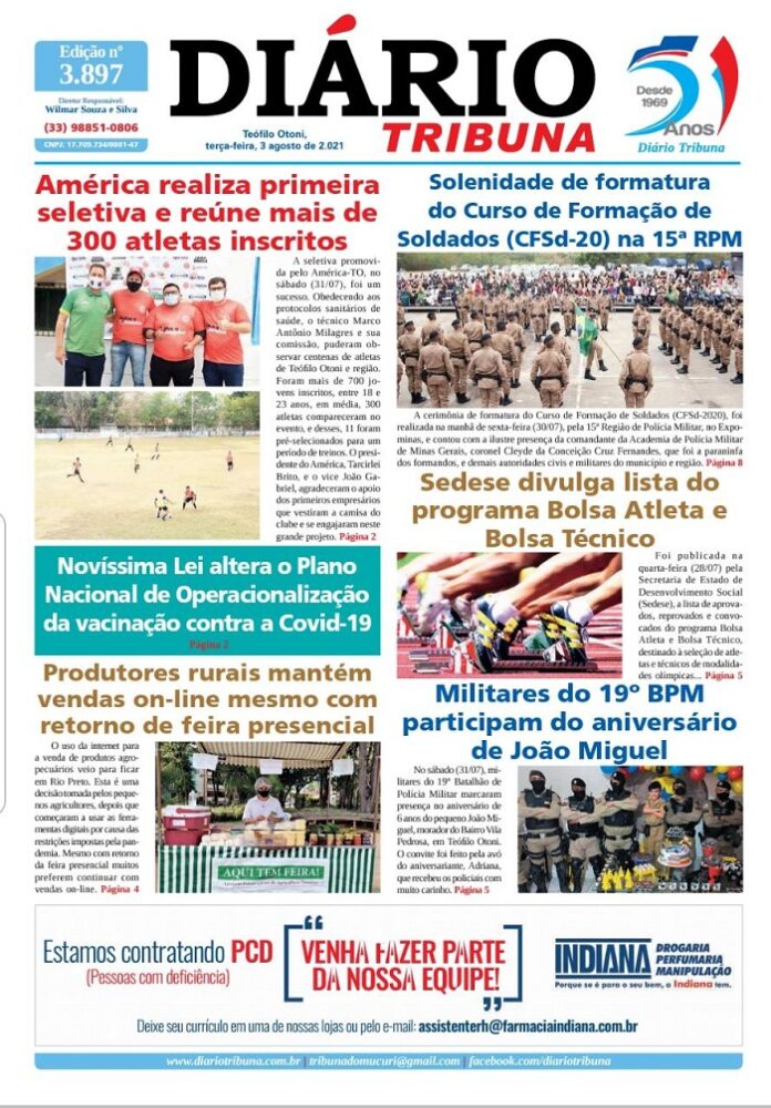Diário Tribuna, 3 de Agosto 2021, Teófilo Otoni – MG Por diariotribuna - 03/08/2021 0 513 Facebook Twitter Google+ Pinterest WhatsApp Acesse o link abaixo e veja a edição completa do Diário Tribuna desta terça-feira (03/08/2021) https://diariotribuna.com.br/wp-content/uploads/2021/08/DIARIO-TRIBUNA-51-ANOS-03-AGOSTO-2021.pdf