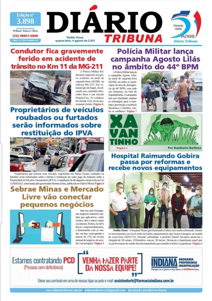 Diário Tribuna, 4 de Agosto 2021, Teófilo Otoni – MG Por diariotribuna - 04/08/2021 0 448 Facebook Twitter Google+ Pinterest WhatsApp Acesse o link abaixo e veja a edição completa do Diário Tribuna desta quarta-feira (04/08/2021) https://diariotribuna.com.br/wp-content/uploads/2021/08/DIARIO-TRIBUNA-51-ANOS-04-AGOSTO-2021.pdf