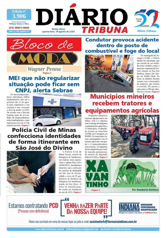 Diário Tribuna, 18 de Agosto 2021, Teófilo Otoni – MG Por diariotribuna - 18/08/2021 0 784 Facebook Twitter Google+ Pinterest WhatsApp Acesse o link abaixo e veja a edição completa do Diário Tribuna desta quarta-feira (18/08/2021) https://diariotribuna.com.br/wp-content/uploads/2021/08/DIARIO-TRIBUNA-52-ANOS-18-AGOSTO-2021.pdf