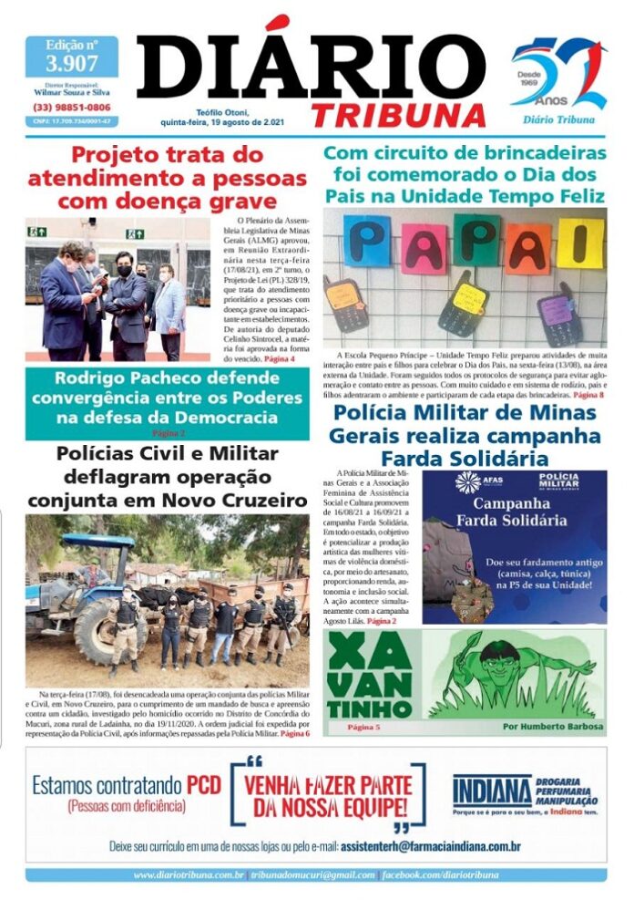Diário Tribuna, 19 de Agosto 2021, Teófilo Otoni – MG Por diariotribuna - 19/08/2021 0 798 Facebook Twitter Google+ Pinterest WhatsApp Acesse o link abaixo e veja a edição completa do Diário Tribuna desta quinta-feira (19/08/2021) https://diariotribuna.com.br/wp-content/uploads/2021/08/DIARIO-TRIBUNA-52-ANOS-19-AGOSTO-2021.pdf