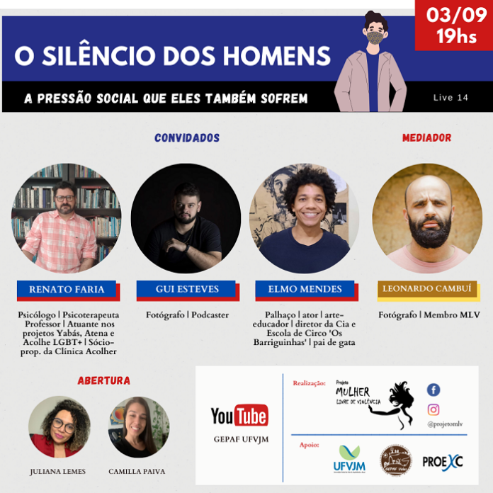Muito falamos sobre as mulheres diante da situação de violência sofrida. No entanto, pouco questionamos sobre o lugar dos homens nesse processo, de maneira crítica e aprofundada. Pois bem! De forma breve, trato de iniciar, nesse espaço, a discussão desse tema que será alvo de um encontro a ser transmitido ao vivo pelo canal youtube do GEPAF UFVJM nesta sexta-feira, dia 03/09/21, às 19hs. Registro neste espaço esta informação, pois o momento, que será a 14ª live, ficará gravado na plataforma, junto à playlist do Projeto MLV.