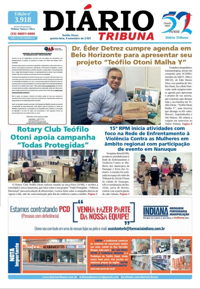 Diário Tribuna, 9 de Setembro 2021, Teófilo Otoni – MG Por diariotribuna - 09/09/2021 0 452 Facebook Twitter Google+ Pinterest WhatsApp Acesse o link abaixo e veja a edição completa do Diário Tribuna desta quinta-feira (09/09/2021) https://diariotribuna.com.br/wp-content/uploads/2021/09/DIARIO-TRIBUNA-52-ANOS-09-SETEMBRO-2021.pdf