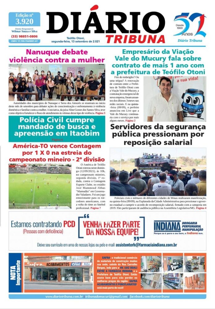 Diário Tribuna, 13 de Setembro 2021, Teófilo Otoni – MG Por diariotribuna - 13/09/2021 0 449 Facebook Twitter Google+ Pinterest WhatsApp Acesse o link abaixo e veja a edição completa do Diário Tribuna desta segunda-feira (13/09/2021) https://diariotribuna.com.br/wp-content/uploads/2021/09/DIARIO-TRIBUNA-52-ANOS-13-SETEMBRO-2021.pdf