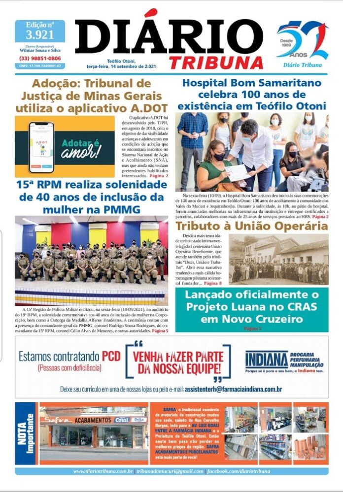 Diário Tribuna, 14 de Setembro 2021, Teófilo Otoni – MG Por diariotribuna - 14/09/2021 0 667 Facebook Twitter Google+ Pinterest WhatsApp Acesse o link abaixo e veja a edição completa do Diário Tribuna desta terça-feira (14/09/2021) https://diariotribuna.com.br/wp-content/uploads/2021/09/DIARIO-TRIBUNA-52-ANOS-14-SETEMBRO-2021.pdf