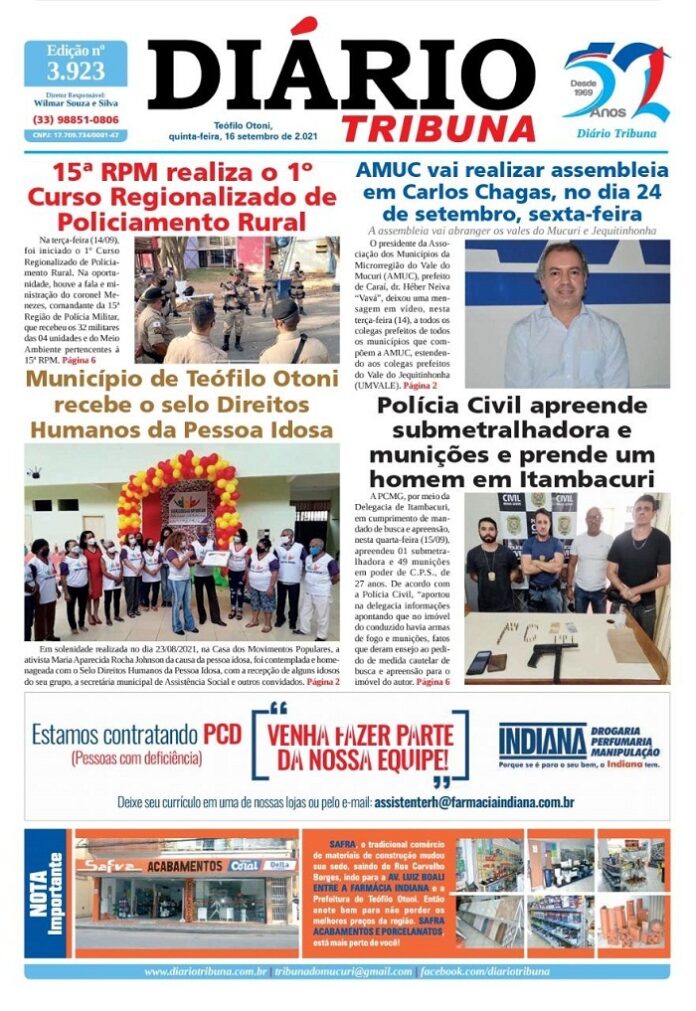 Diário Tribuna, 16 de Setembro 2021, Teófilo Otoni – MG Por diariotribuna - 16/09/2021 0 595 Facebook Twitter Google+ Pinterest WhatsApp Acesse o link abaixo e veja a edição completa do Diário Tribuna desta quinta-feira (16/09/2021) https://diariotribuna.com.br/wp-content/uploads/2021/09/DIARIO-TRIBUNA-52-ANOS-16-SETEMBRO-2021.pdf