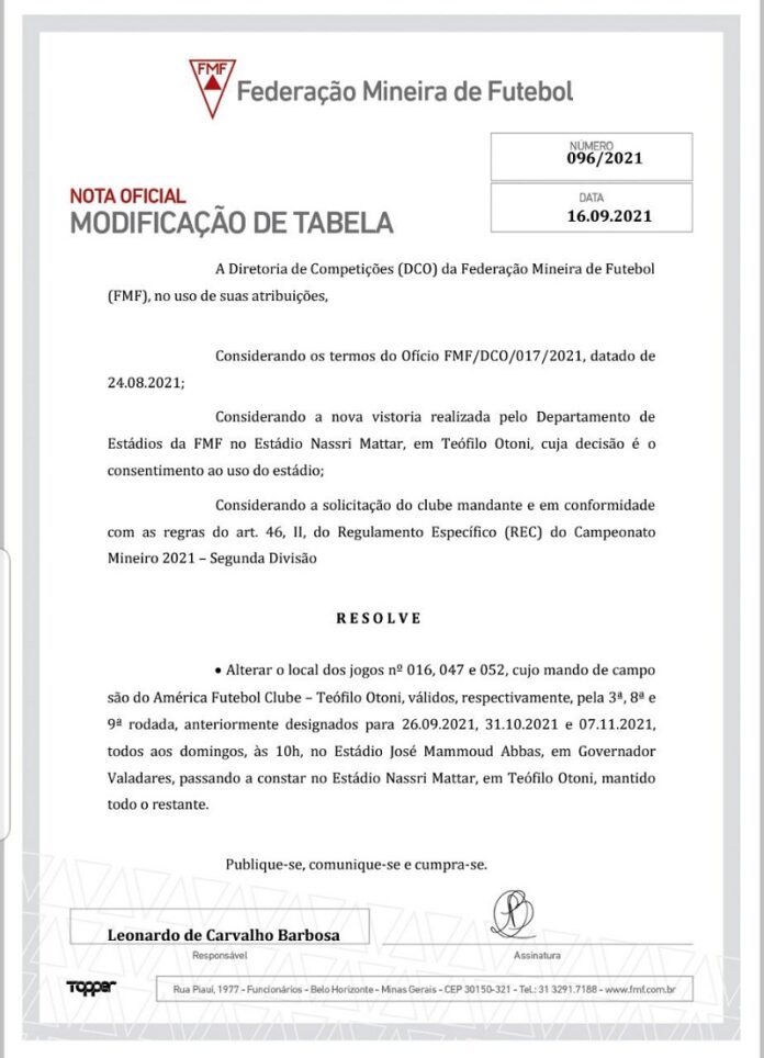 FMF faz nova vistoria no Estádio Nassri Mattar e autoriza jogos em Teófilo Otoni Por diariotribuna - 16/09/2021 0 644 Facebook Twitter Google+ Pinterest WhatsApp A Federação Mineira de Futebol (FMF), emitiu nota oficial, nesta quinta-feira (16/09/2021), e após nova vistoria no Estádio Nassri Mattar, autoriza jogos do América em Teófilo Otoni. Veja abaixo a nota na íntegra:
