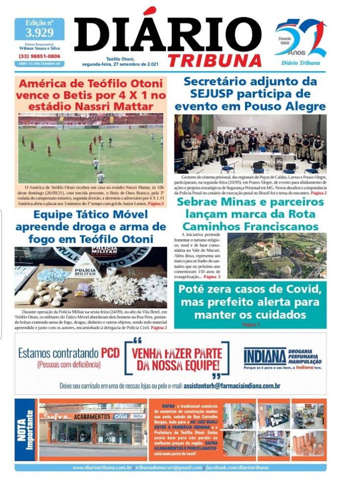 Diário Tribuna, 27 de Setembro 2021, Teófilo Otoni – MG Por diariotribuna - 27/09/2021 0 318 Facebook Twitter Google+ Pinterest WhatsApp Acesse o link abaixo e veja a edição completa do Diário Tribuna desta segunda-feira (27/09/2021) https://diariotribuna.com.br/wp-content/uploads/2021/09/DIARIO-TRIBUNA-52-ANOS-27-SETEMBRO-2021.pdf