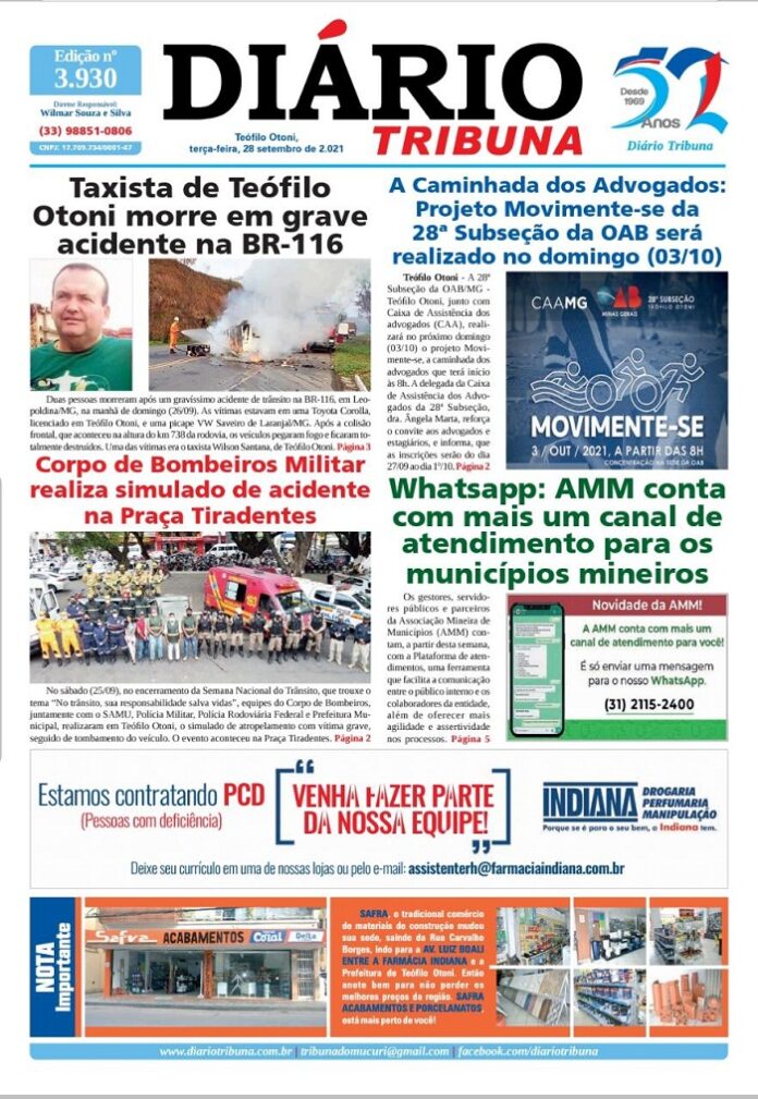 Diário Tribuna, 28 de Setembro 2021, Teófilo Otoni – MG Por diariotribuna - 28/09/2021 0 638 Facebook Twitter Google+ Pinterest WhatsApp Acesse o link abaixo e veja a edição completa do Diário Tribuna desta terça-feira (28/09/2021) https://diariotribuna.com.br/wp-content/uploads/2021/09/DIARIO-TRIBUNA-52-ANOS-28-SETEMBRO-2021.pdf