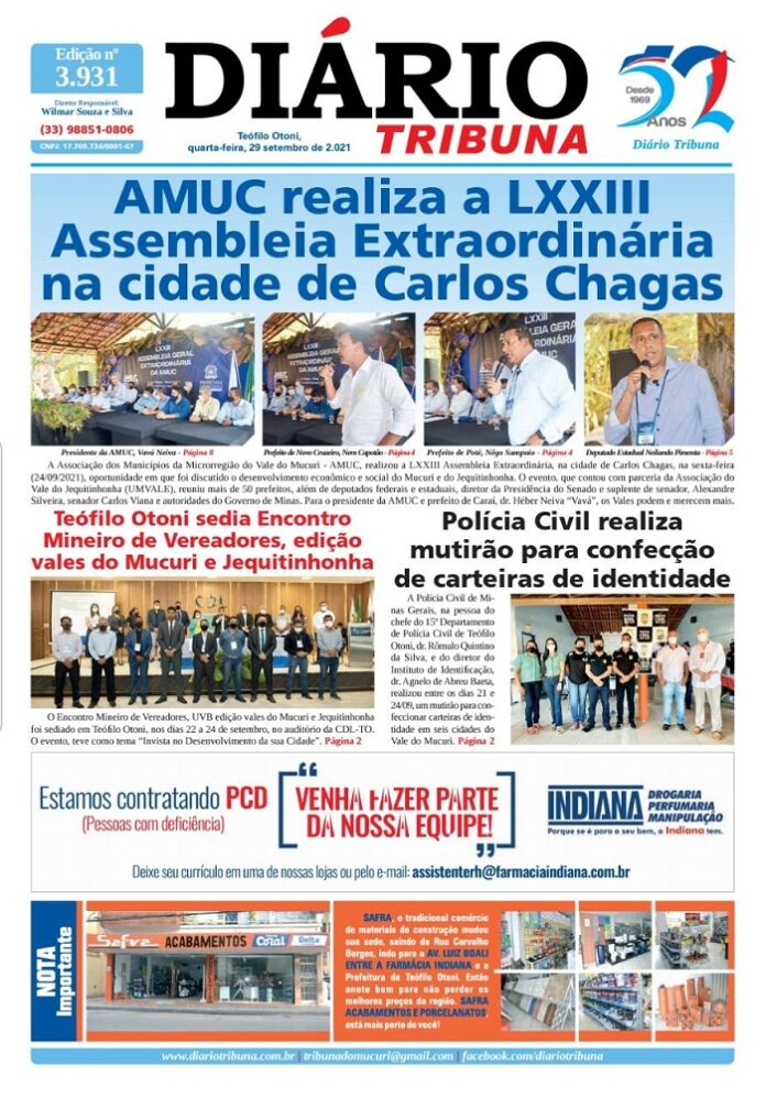 Diário Tribuna, 29 de Setembro 2021, Teófilo Otoni – MG Por diariotribuna - 29/09/2021 0 311 Facebook Twitter Google+ Pinterest WhatsApp Acesse o link abaixo e veja a edição completa do Diário Tribuna desta quarta-feira (29/09/2021) https://diariotribuna.com.br/wp-content/uploads/2021/09/DIARIO-TRIBUNA-52-ANOS-29-SETEMBRO-2021.pdf