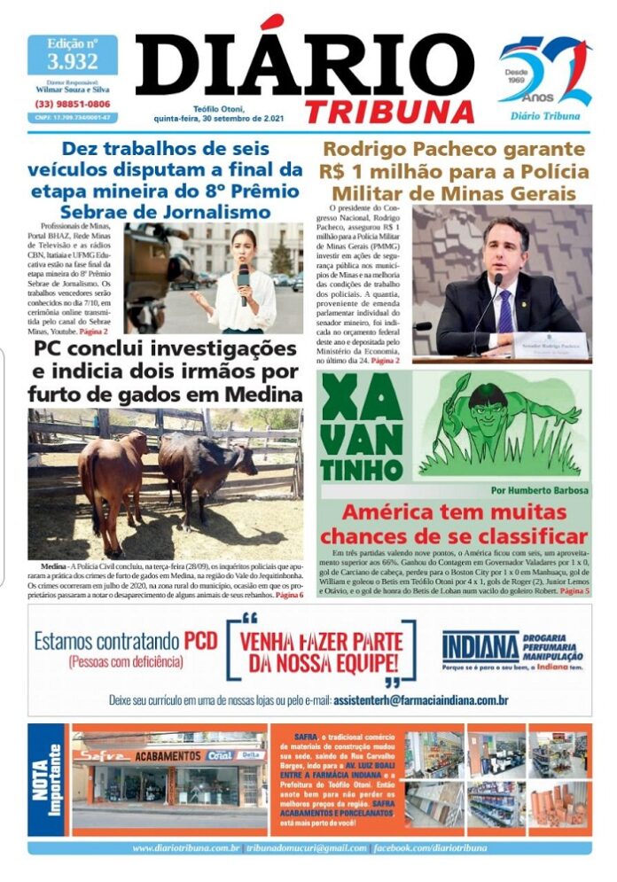 Diário Tribuna, 30 de Setembro 2021, Teófilo Otoni – MG Por diariotribuna - 30/09/2021 0 616 Facebook Twitter Google+ Pinterest WhatsApp Acesse o link abaixo e veja a edição completa do Diário Tribuna desta quinta-feira (30/09/2021) https://diariotribuna.com.br/wp-content/uploads/2021/09/DIARIO-TRIBUNA-52-ANOS-30-SETEMBRO-2021.pdf