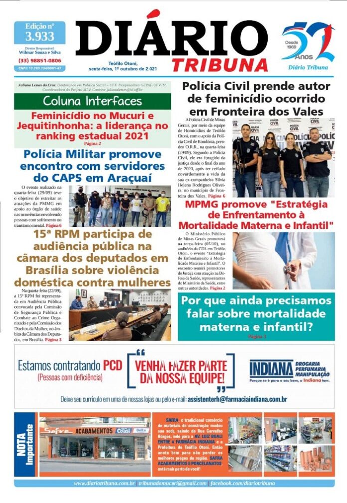 Diário Tribuna, 01 de Outubro 2021, Teófilo Otoni – MG Por diariotribuna - 01/10/2021 0 766 Facebook Twitter Google+ Pinterest WhatsApp Acesse o link abaixo e veja a edição completa do Diário Tribuna desta sexta-feira (01/10/2021) https://diariotribuna.com.br/wp-content/uploads/2021/10/DIARIO-TRIBUNA-52-ANOS-01-OUTUBRO-2021.pdf