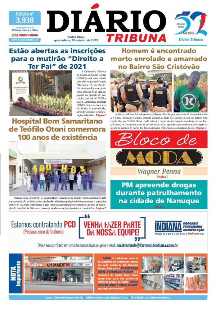 Diário Tribuna, 13 de Outubro 2021, Teófilo Otoni – MG Por diariotribuna - 13/10/2021 0 743 Facebook Twitter Google+ Pinterest WhatsApp Acesse o link abaixo e veja a edição completa do Diário Tribuna desta quarta-feira (13/10/2021) https://diariotribuna.com.br/wp-content/uploads/2021/10/DIARIO-TRIBUNA-52-ANOS-13-OUTUBRO-2021.pdf