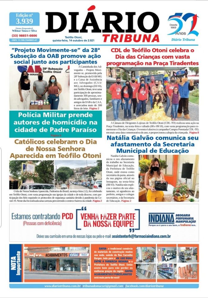 Diário Tribuna, 14 de Outubro 2021, Teófilo Otoni – MG Por diariotribuna - 14/10/2021 0 257 Facebook Twitter Google+ Pinterest WhatsApp Acesse o link abaixo e veja a edição completa do Diário Tribuna desta quinta-feira (14/10/2021) https://diariotribuna.com.br/wp-content/uploads/2021/10/DIARIO-TRIBUNA-52-ANOS-14-OUTUBRO-2021.pdf