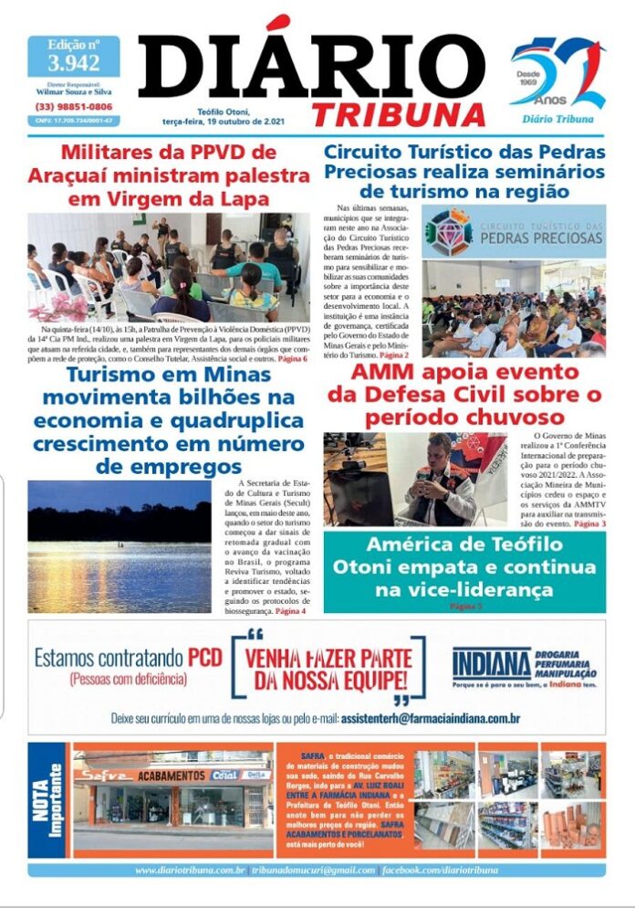 Diário Tribuna, 19 de Outubro 2021, Teófilo Otoni – MG Por diariotribuna - 19/10/2021 0 800 Facebook Twitter Google+ Pinterest WhatsApp Acesse o link abaixo e veja a edição completa do Diário Tribuna desta terça-feira (19/10/2021) https://diariotribuna.com.br/wp-content/uploads/2021/10/DIARIO-TRIBUNA-52-ANOS-19-OUTUBRO-2021.pdf