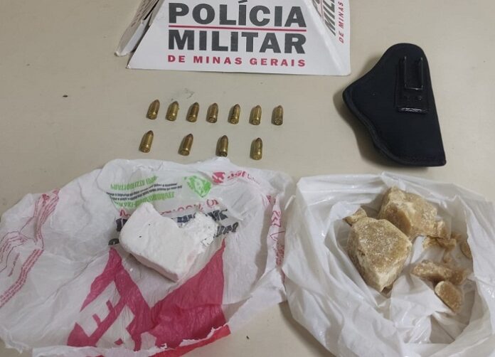 Durante buscas nas imediações em que os suspeitos estavam os policiais localizaram, 150 gramas de crack, 100 gramas de cocaína, 11 cartuchos calibre 9mm e 01 coldre de pistola. Equipe Tático Móvel: sargentos Jaime, Wanderson e Amorim, cabo Jisleres. (Informações/Foto: PMMG/ 19º BPM).