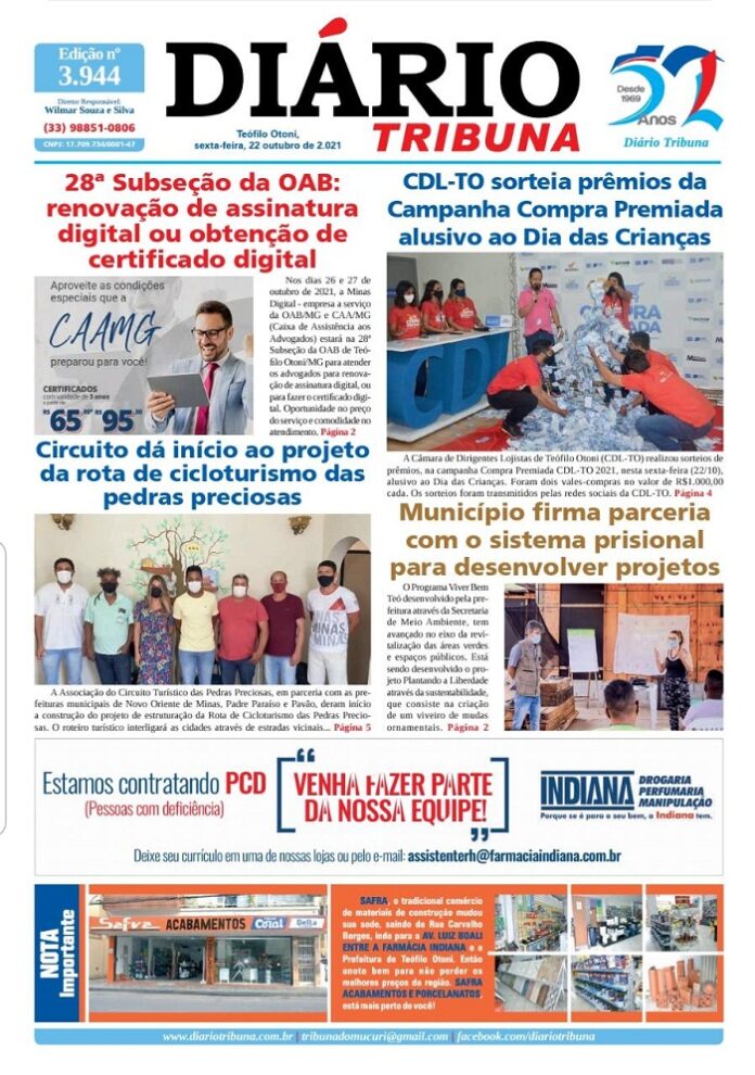 Diário Tribuna, 22 de Outubro 2021, Teófilo Otoni – MG Por diariotribuna - 22/10/2021 0 392 Facebook Twitter Google+ Pinterest WhatsApp Acesse o link abaixo e veja a edição completa do Diário Tribuna desta sexta-feira (22/10/2021) https://diariotribuna.com.br/wp-content/uploads/2021/10/DIARIO-TRIBUNA-52-ANOS-22-OUTUBRO-2021.pdf