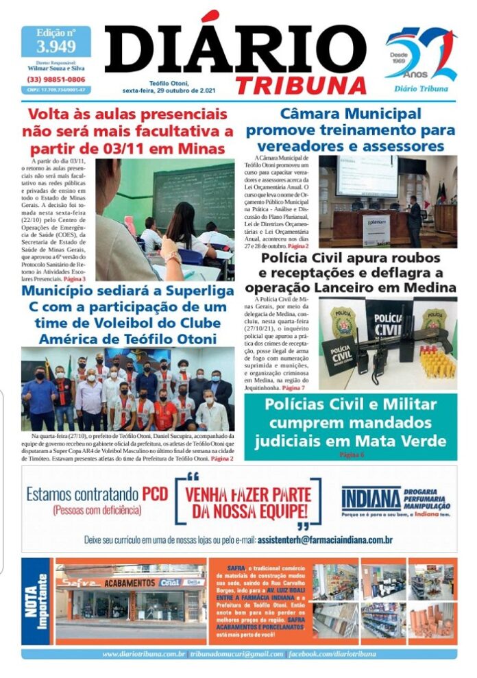 Diário Tribuna, 29 de Outubro 2021, Teófilo Otoni – MG Por diariotribuna - 29/10/2021 0 662 Facebook Twitter Google+ Pinterest WhatsApp Acesse o link abaixo e veja a edição completa do Diário Tribuna desta sexta-feira (29/10/2021) https://diariotribuna.com.br/wp-content/uploads/2021/10/DIARIO-TRIBUNA-52-ANOS-29-OUTUBRO-2021.pdf