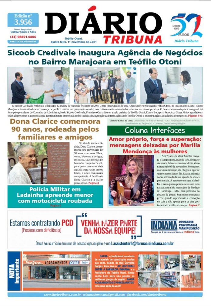 Diário Tribuna, 11 de Novembro 2021, Teófilo Otoni – MG Por diariotribuna - 11/11/2021 0 572 Facebook Twitter Google+ Pinterest WhatsApp Acesse o link abaixo e veja a edição completa do Diário Tribuna desta quinta-feira (11/11/2021) https://diariotribuna.com.br/wp-content/uploads/2021/11/DIARIO-TRIBUNA-52-ANOS-11-NOVEMBRO-2021.pdf