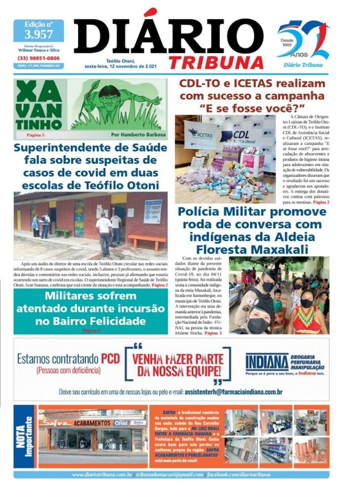 Diário Tribuna, 12 de Novembro 2021, Teófilo Otoni – MG Por diariotribuna - 12/11/2021 0 442 Facebook Twitter Google+ Pinterest WhatsApp Acesse o link abaixo e veja a edição completa do Diário Tribuna desta sexta-feira (12/11/2021) https://diariotribuna.com.br/wp-content/uploads/2021/11/DIARIO-TRIBUNA-52-ANOS-12-NOVEMBRO-2021.pdf