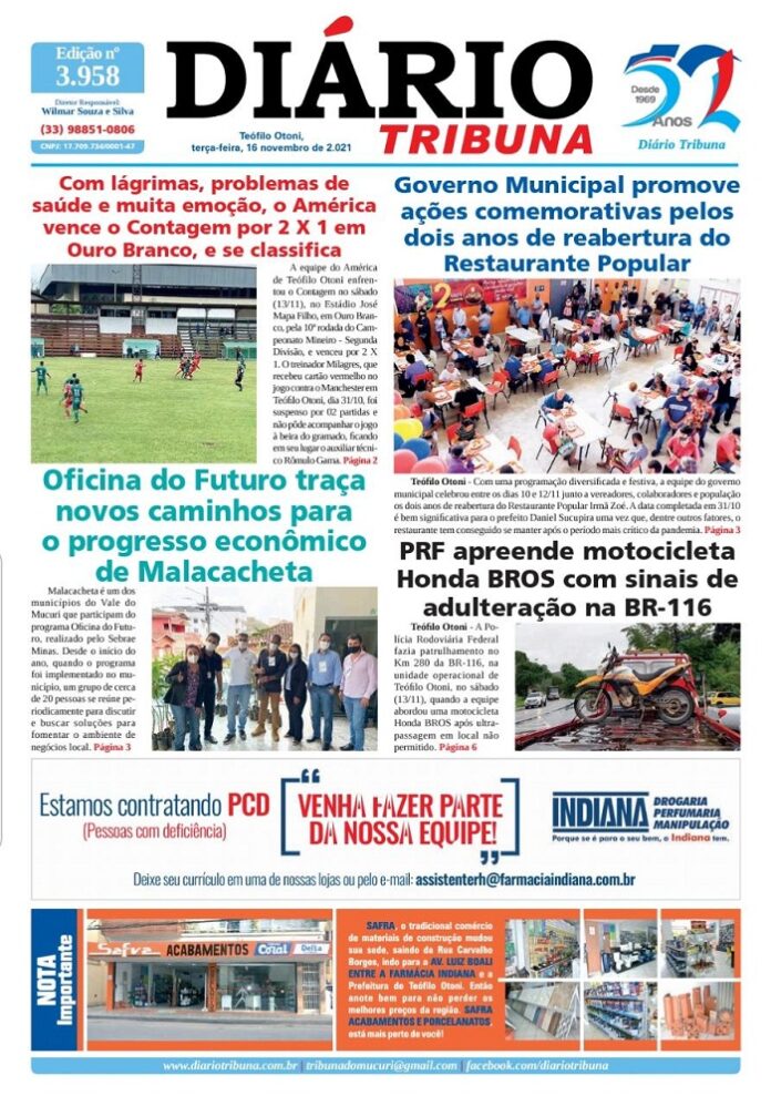 Diário Tribuna, 16 de Novembro 2021, Teófilo Otoni – MG Por diariotribuna - 16/11/2021 0 666 Facebook Twitter Google+ Pinterest WhatsApp Acesse o link abaixo e veja a edição completa do Diário Tribuna desta terça-feira (16/11/2021) https://diariotribuna.com.br/wp-content/uploads/2021/11/DIARIO-TRIBUNA-52-ANOS-16-NOVEMBRO-2021.pdf