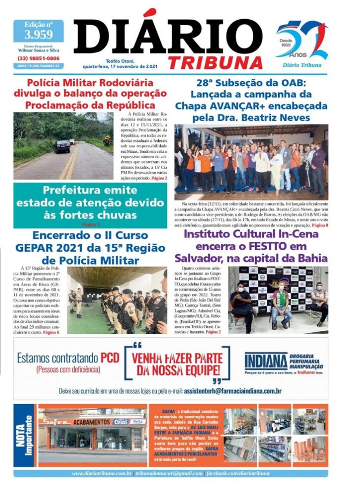 Diário Tribuna, 17 de Novembro 2021, Teófilo Otoni – MG Por diariotribuna - 17/11/2021 0 552 Facebook Twitter Google+ Pinterest WhatsApp Acesse o link abaixo e veja a edição completa do Diário Tribuna desta quarta-feira (17/11/2021) https://diariotribuna.com.br/wp-content/uploads/2021/11/DIARIO-TRIBUNA-52-ANOS-17-NOVEMBRO-2021.pdf