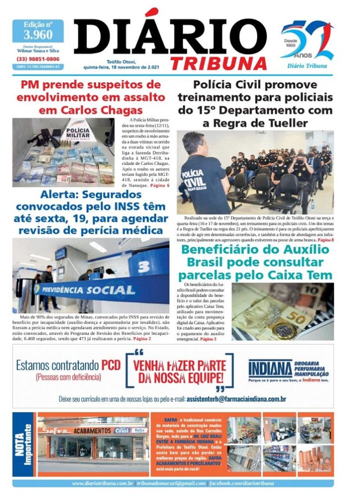 Diário Tribuna, 18 de Novembro 2021, Teófilo Otoni – MG Por diariotribuna - 18/11/2021 0 357 Facebook Twitter Google+ Pinterest WhatsApp Acesse o link abaixo e veja a edição completa do Diário Tribuna desta quinta-feira (18/11/2021) https://diariotribuna.com.br/wp-content/uploads/2021/11/DIARIO-TRIBUNA-52-ANOS-18-NOVEMBRO-2021.pdf