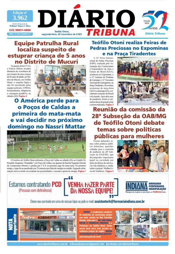 Diário Tribuna, 22 de Novembro 2021, Teófilo Otoni – MG Por diariotribuna - 22/11/2021 0 728 Facebook Twitter Google+ Pinterest WhatsApp Acesse o link abaixo e veja a edição completa do Diário Tribuna desta segunda-feira (22/11/2021) https://diariotribuna.com.br/wp-content/uploads/2021/11/DIARIO-TRIBUNA-52-ANOS-22-NOVEMBRO-2021.pdf