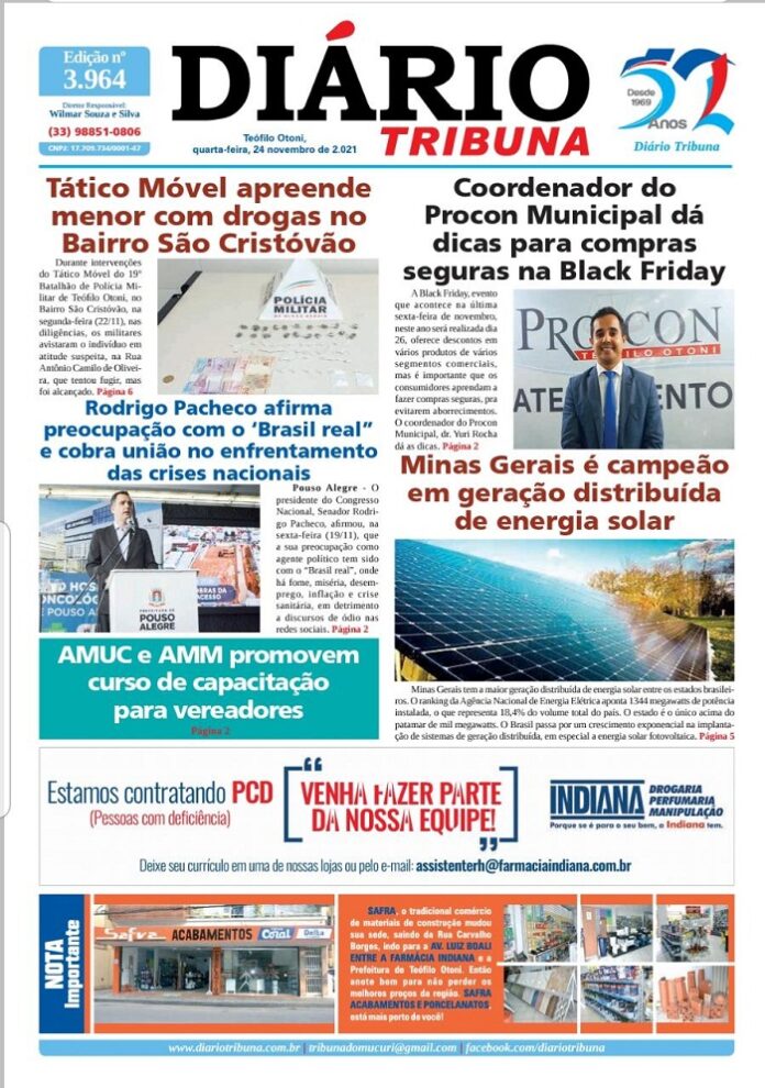 Diário Tribuna, 24 de Novembro 2021, Teófilo Otoni – MG Por diariotribuna - 24/11/2021 0 719 Facebook Twitter Google+ Pinterest WhatsApp Acesse o link abaixo e veja a edição completa do Diário Tribuna desta quarta-feira (24/11/2021) https://diariotribuna.com.br/wp-content/uploads/2021/11/DIARIO-TRIBUNA-52-ANOS-24-NOVEMBRO-2021.pdf