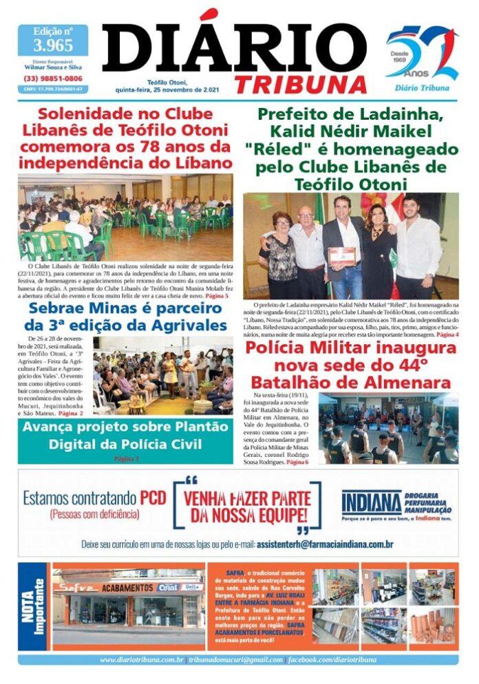 Diário Tribuna, 25 de Novembro 2021, Teófilo Otoni – MG Por diariotribuna - 25/11/2021 0 647 Facebook Twitter Google+ Pinterest WhatsApp Acesse o link abaixo e veja a edição completa do Diário Tribuna desta quinta-feira (25/11/2021) https://diariotribuna.com.br/wp-content/uploads/2021/11/DIARIO-TRIBUNA-52-ANOS-25-NOVEMBRO-2021.pdf