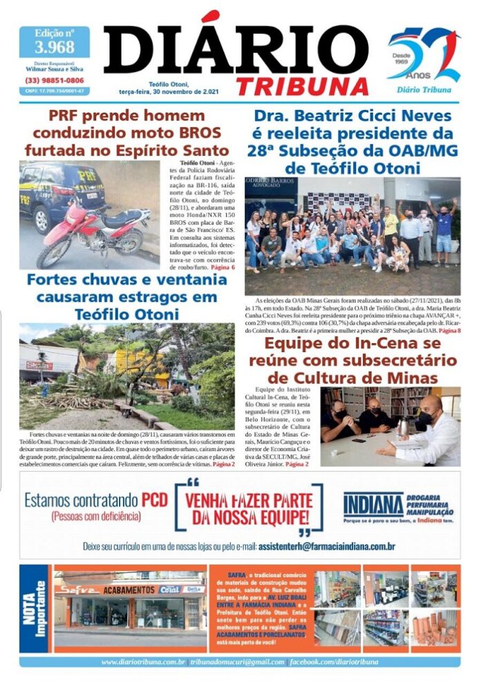 Diário Tribuna, 30 de Novembro 2021, Teófilo Otoni – MG Por diariotribuna - 30/11/2021 0 764 Facebook Twitter Google+ Pinterest WhatsApp Acesse o link abaixo e veja a edição completa do Diário Tribuna desta terça-feira (30/11/2021) https://diariotribuna.com.br/wp-content/uploads/2021/11/DIARIO-TRIBUNA-52-ANOS-30-NOVEMBRO-2021.pdf