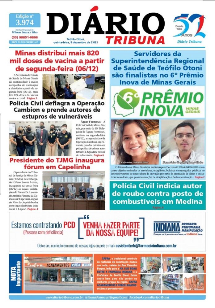 Diário Tribuna, 09 de Dezembro 2021, Teófilo Otoni – MG Por diariotribuna - 09/12/2021 0 673 Facebook Twitter Google+ Pinterest WhatsApp Acesse o link abaixo e veja a edição completa do Diário Tribuna desta quinta-feira (09/12/2021) https://diariotribuna.com.br/wp-content/uploads/2021/12/DIARIO-TRIBUNA-52-ANOS-09-DEZEMBRO-2021.pdf