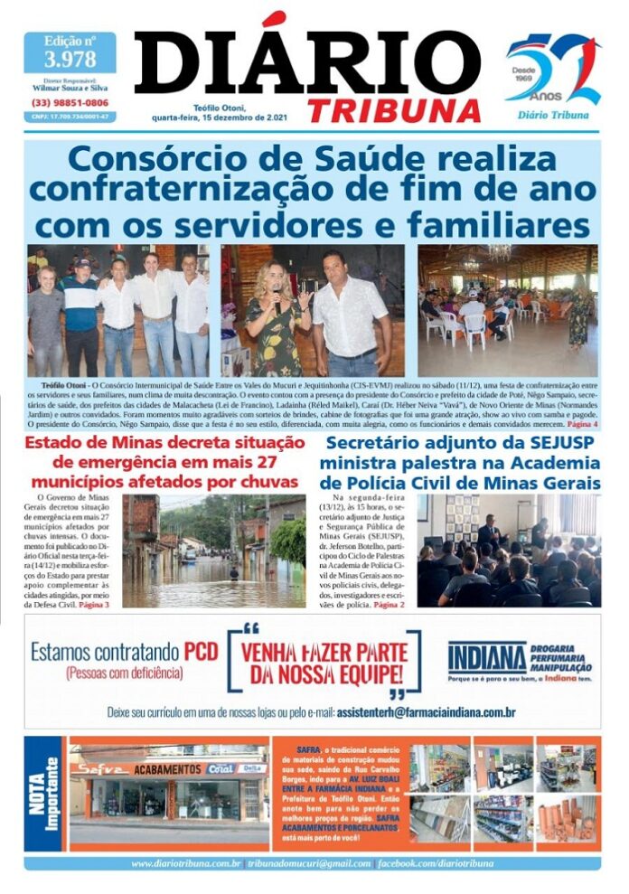 Diário Tribuna, 15 de Dezembro 2021, Teófilo Otoni – MG Por diariotribuna - 15/12/2021 0 778 Facebook Twitter Google+ Pinterest WhatsApp Acesse o link abaixo e veja a edição completa do Diário Tribuna desta quarta-feira (15/12/2021) https://diariotribuna.com.br/wp-content/uploads/2021/12/DIARIO-TRIBUNA-52-ANOS-15-DEZEMBRO-2021.pdf