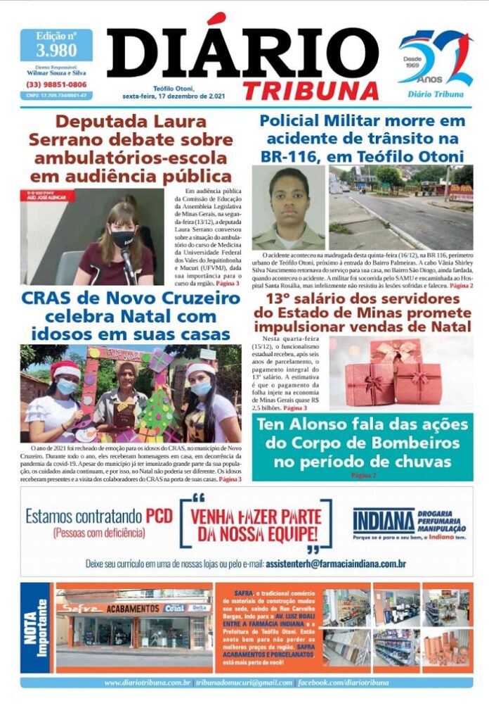 Diário Tribuna, 17 de Dezembro 2021, Teófilo Otoni – MG Por diariotribuna - 17/12/2021 0 869 Facebook Twitter Google+ Pinterest WhatsApp Acesse o link abaixo e veja a edição completa do Diário Tribuna desta sexta-feira (17/12/2021) https://diariotribuna.com.br/wp-content/uploads/2021/12/DIARIO-TRIBUNA-52-ANOS-17-DEZEMBRO-2021.pdf