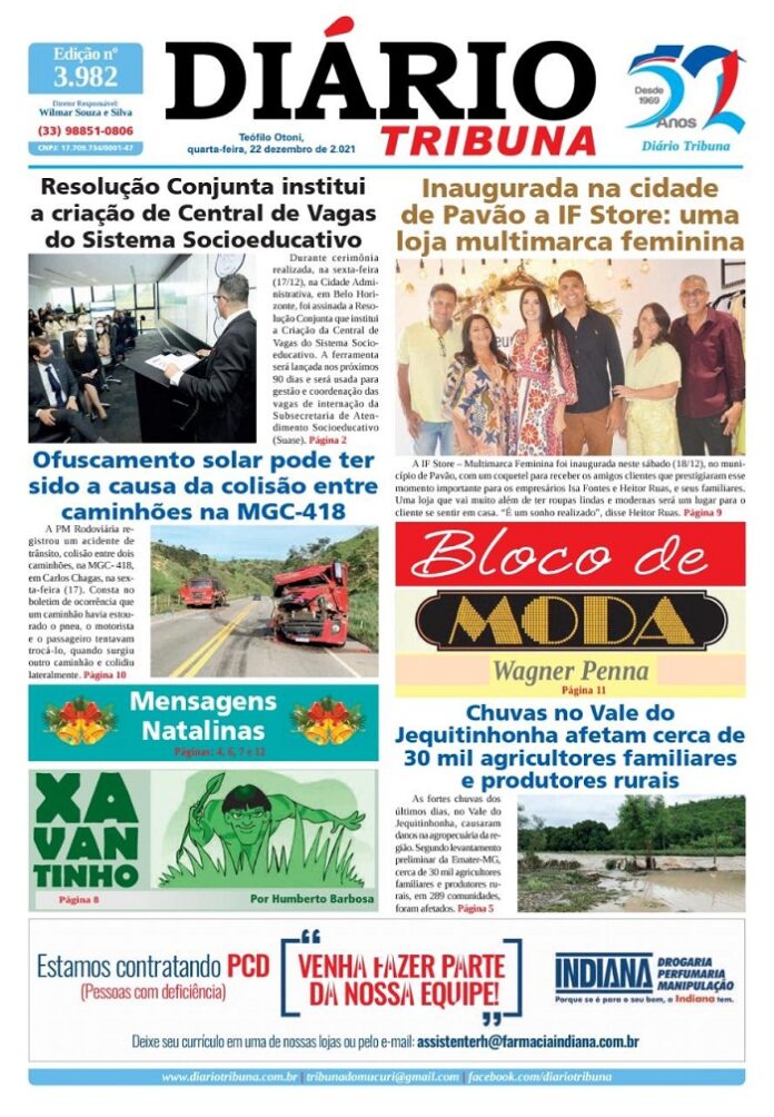 Diário Tribuna, 22 de Dezembro 2021, Teófilo Otoni – MG Por diariotribuna - 22/12/2021 0 1250 Facebook Twitter Google+ Pinterest WhatsApp Acesse o link abaixo e veja a edição completa do Diário Tribuna desta quarta-feira (22/12/2021) https://diariotribuna.com.br/wp-content/uploads/2021/12/DIARIO-TRIBUNA-52-ANOS-22-DEZEMBRO-2021.pdf