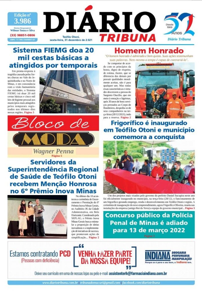 Diário Tribuna, 31 de Dezembro 2021, Teófilo Otoni – MG Por diariotribuna - 31/12/2021 0 617 Facebook Twitter Google+ Pinterest WhatsApp Acesse o link abaixo e veja a edição completa do Diário Tribuna desta sexta-feira (31/12/2021) https://diariotribuna.com.br/wp-content/uploads/2021/12/DIARIO-TRIBUNA-52-ANOS-31-DEZEMBRO-2021.pdf