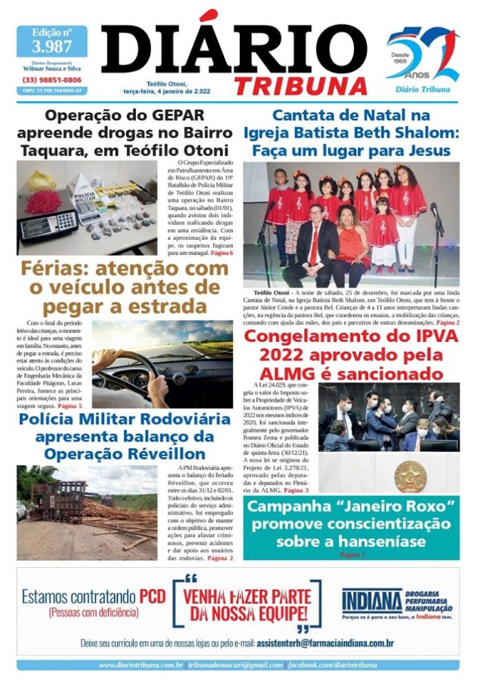 Diário Tribuna, 04 de Janeiro 2022, Teófilo Otoni – MG Por diariotribuna - 04/01/2022 0 665 Facebook Twitter Google+ Pinterest WhatsApp Acesse o link abaixo e veja a edição completa do Diário Tribuna desta terça-feira (04/01/2022) https://diariotribuna.com.br/wp-content/uploads/2022/01/DIARIO-TRIBUNA-52-ANOS-04-JANEIRO-2022.pdf