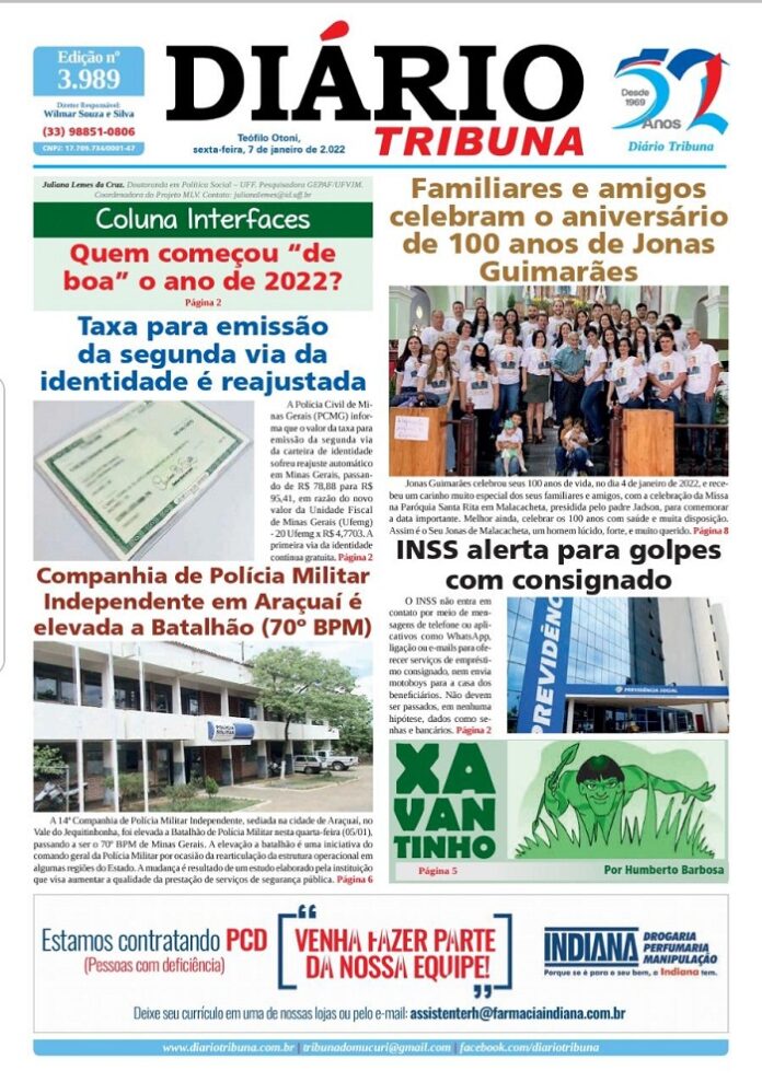 Diário Tribuna, 07 de Janeiro 2022, Teófilo Otoni – MG Por diariotribuna - 07/01/2022 0 728 Facebook Twitter Google+ Pinterest WhatsApp Acesse o link abaixo e veja a edição completa do Diário Tribuna desta sexta-feira (07/01/2022) https://diariotribuna.com.br/wp-content/uploads/2022/01/DIARIO-TRIBUNA-52-ANOS-07-JANEIRO-2022.pdf