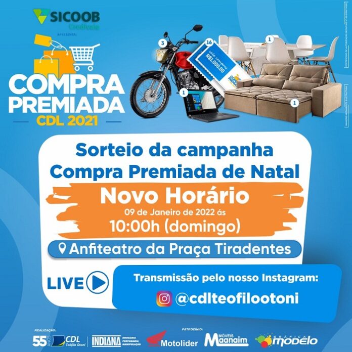 A Câmara de Dirigentes Lojistas de Teófilo Otoni (CDL-TO), vai realizar no domingo (09/01/2022), às 10h, no Anfiteatro da Praça Tiradentes, mais um sorteio da Campanha Compra Premiada CDL-TO 2021, alusivo ao Natal.