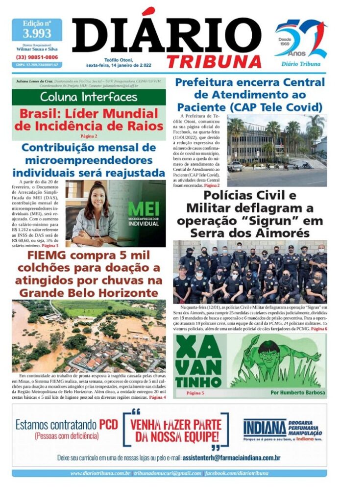 Diário Tribuna, 14 de Janeiro 2022, Teófilo Otoni – MG Por diariotribuna - 14/01/2022 0 310 Facebook Twitter Google+ Pinterest WhatsApp Acesse o link abaixo e veja a edição completa do Diário Tribuna desta sexta-feira (14/01/2022) https://diariotribuna.com.br/wp-content/uploads/2022/01/DIARIO-TRIBUNA-52-ANOS-14-JANEIRO-2022.pdf